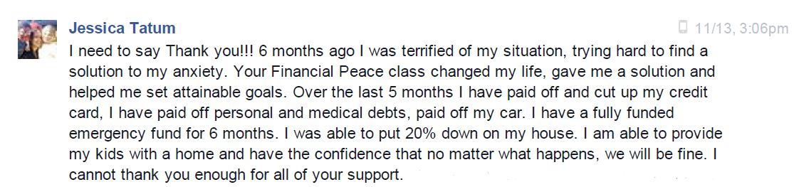 This was the start of her awesome. She was a new single mom on her own and now had $1,000 saved up for emergencies. Can you imagine how awesome this must have felt? This was proof she was actually going to take control of her life.