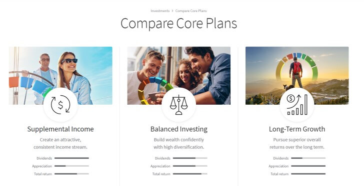 This is the most popular of the advanced investing plans. The balanced investing strategy favors dividends, but you still have plenty of upside potential with equity investing too.