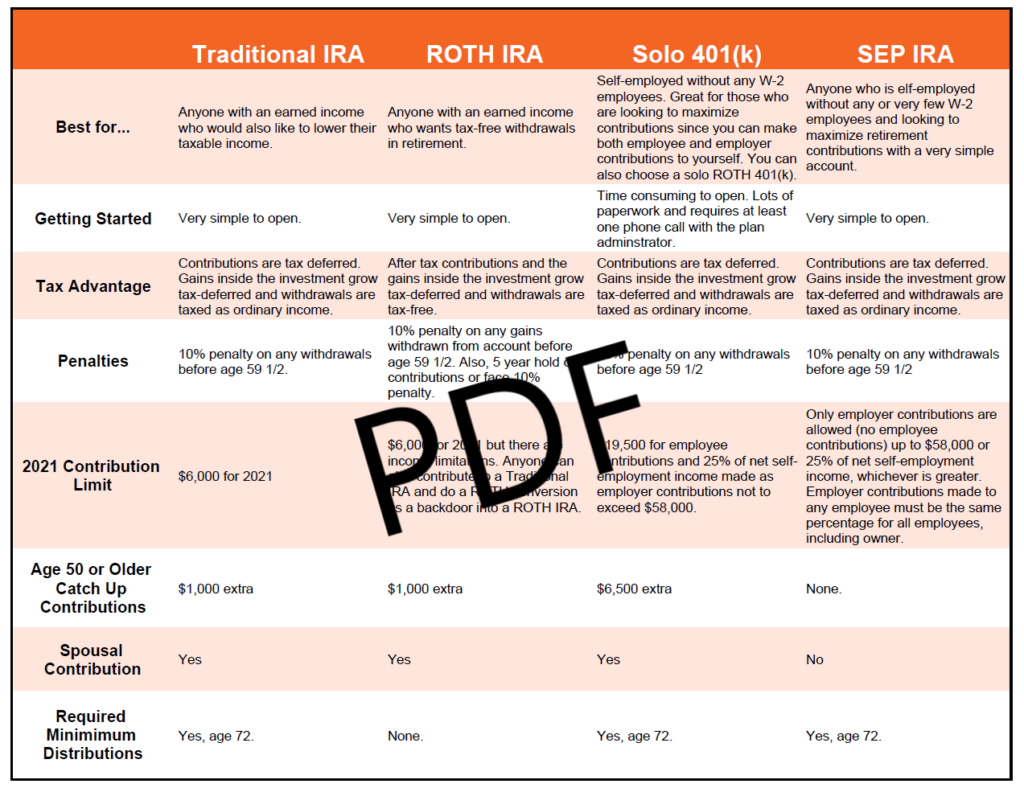 We are going to a brief recap of two retirement accounts we mentioned last week: the Traditional IRA and the ROTH IRA. Then we are going to dive into two other retirement accounts that allow you to save A LOT more than the ROTH or Traditional IRA – the Solo 401(k) and the SEP IRA.