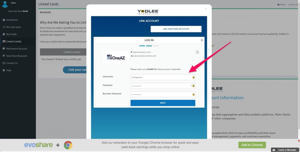 Depending on the security rules for your bank, you may need to have your phone nearby to verify access to your bank/credit union. Also, notice how Yodlee is actually handling this process and not Evoshare. You can read up on how Yodlee keeps you safe here.